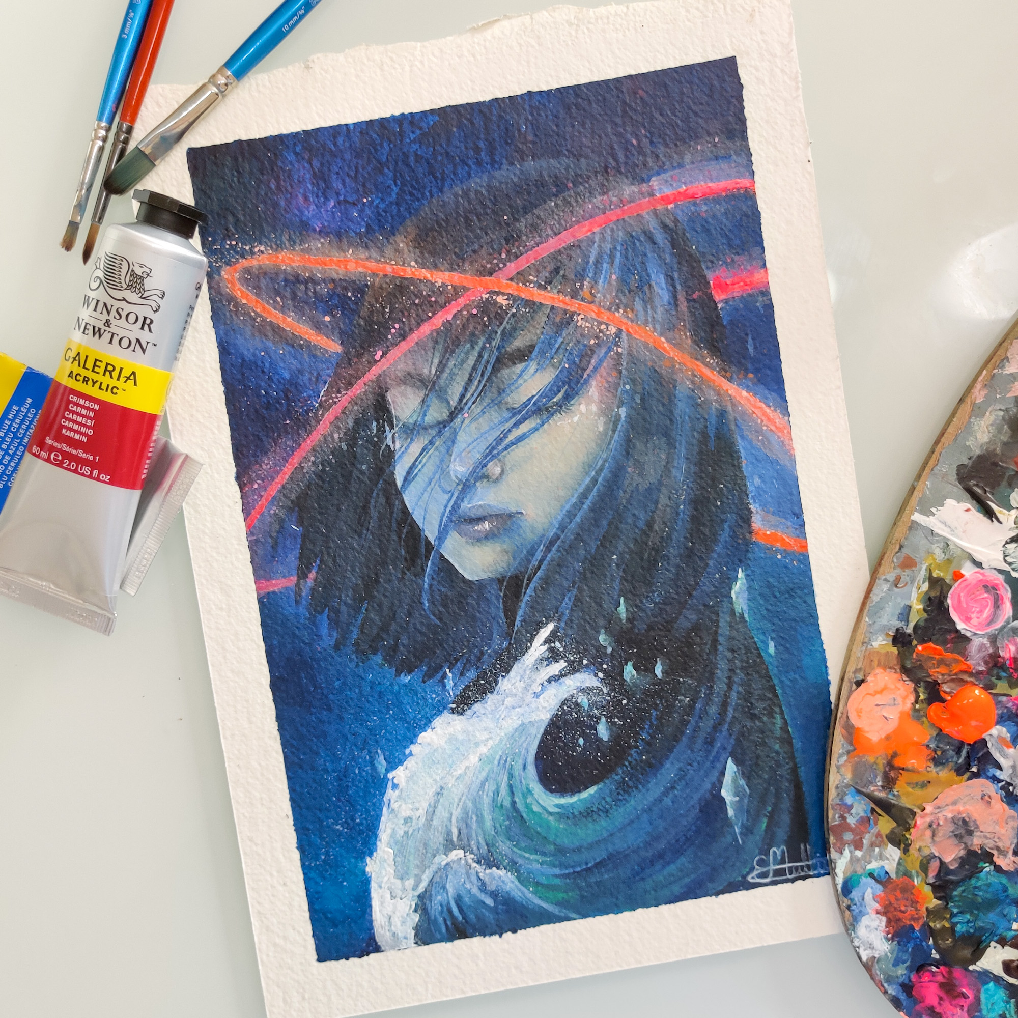 A surreal illustration of a girl, a wave and stars ✧ Made with acrylic paint